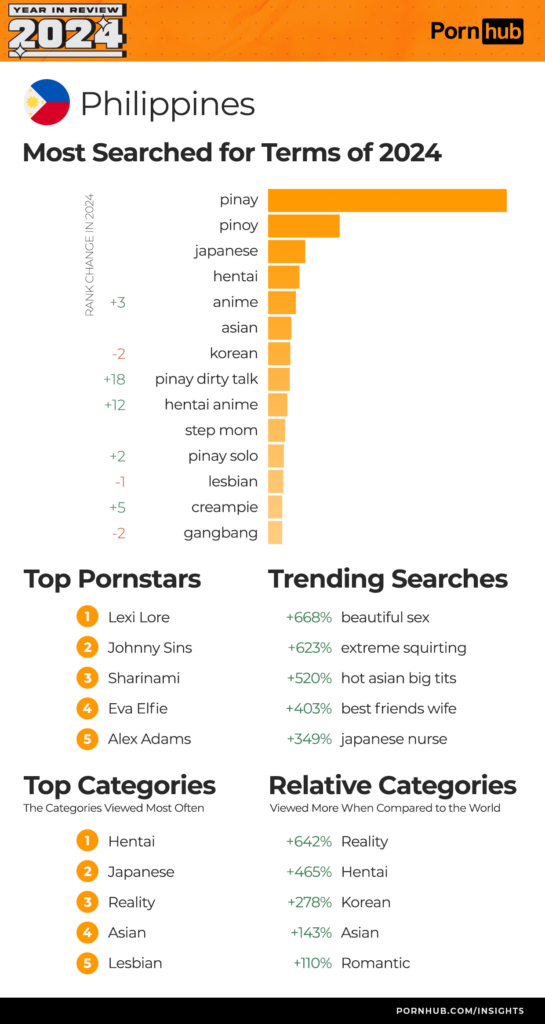Just like France, the Philippines exhibited a strong interest in their local culture when it came to search trends. Dominating the rankings were terms tied to their national identity, with “Pinay” leading the list, followed closely by “Pinoy”. These top two terms have consistently held their positions since 2023. Completing the top four were “Japanese” and “Hentai,” which have also maintained their spots.