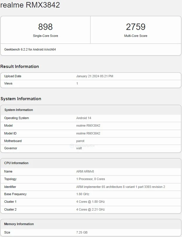 Impressively, the realme 12 Pro 5G notched up 898 points in the single-core test and 2,759 points in the multi-core test on GeekBench. Delving into its specifications, the listing reveals the powerhouse within, equipped with the Qualcomm Snapdragon 6 Gen 1 SoC coupled with an Adreno 710 GPU. Additionally, the smartphone boasts up to 8GB of RAM and will operate on the Android 14 OS, complemented by realme’s custom skin, Realme UI 5, straight out of the box.