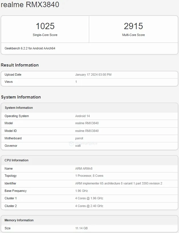 Identified with the model number RMX3840, the realme 12 Pro+ on Geekbench reveals intriguing hardware details. The motherboard, codenamed Parrot, houses a powerful chipset configuration with four cores clocked at 1.96GHz and another four at 2.40GHz.