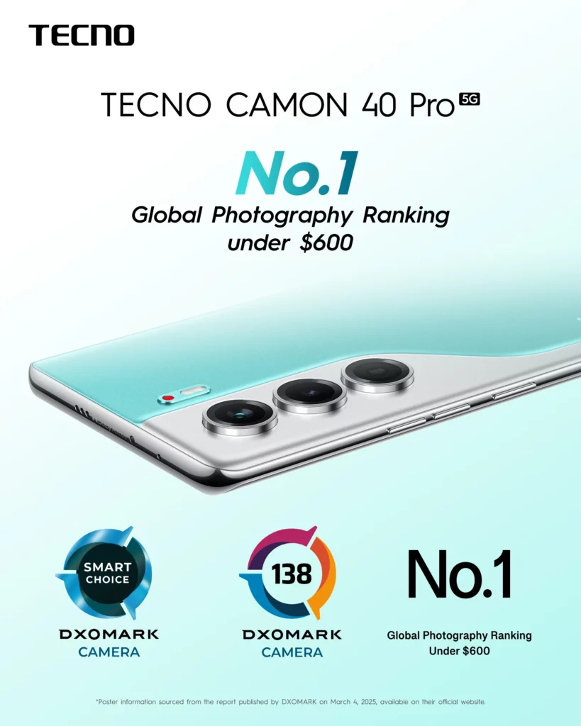 The CAMON 40 Pro 5G stands out with an exceptional camera score of 138 from DXOMARK, ranking No.1 in DXOMARK’s Global Photography Ranking Under $600 and the first smartphone of 2025 to receive DXOMARK’s Smart Choice Label.