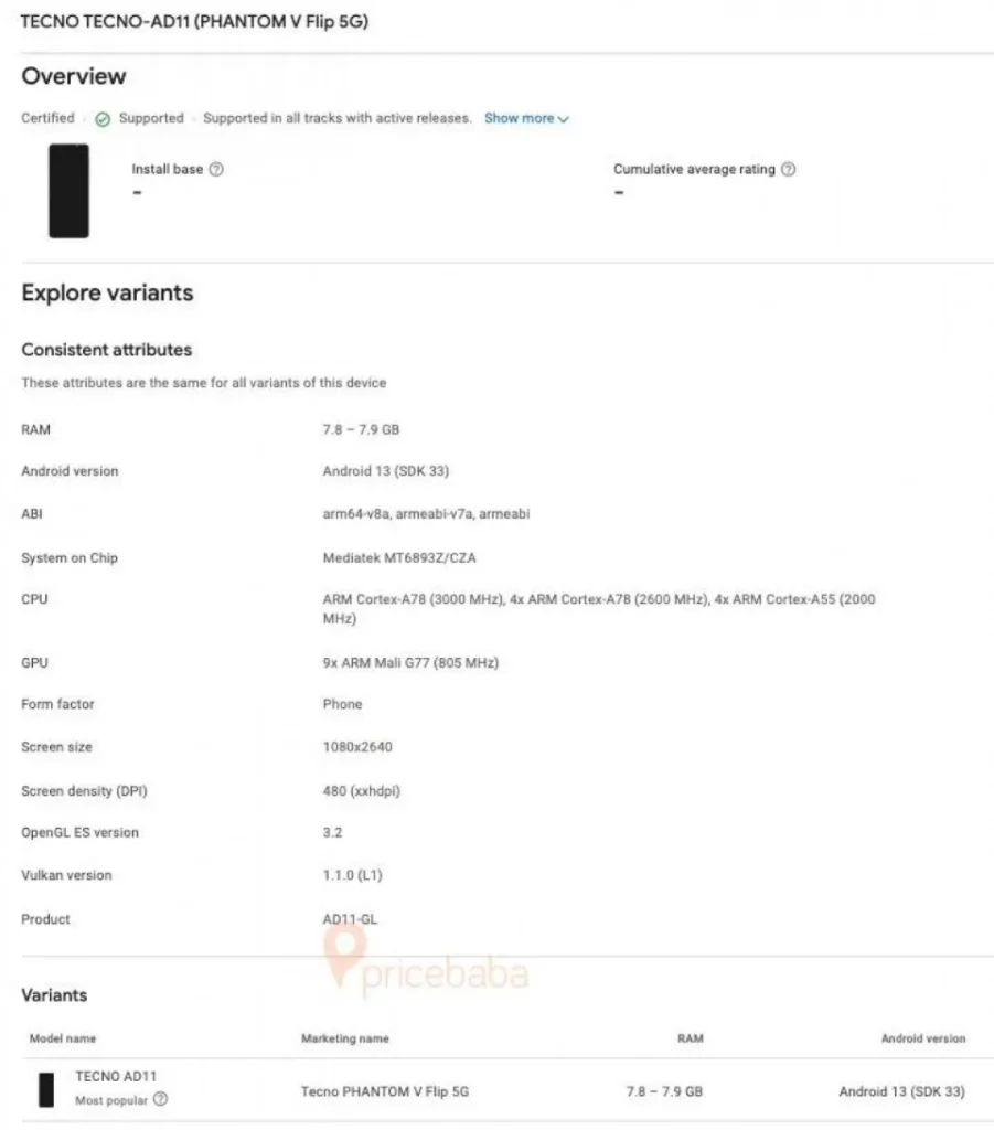 According to PriceBaba, the Google Play Console listing for the phone reveals some key details, including its RAM, chipset, and display resolution. The Phantom V Flip will have 8GB of RAM, the Mediatek Dimensity 1300 chipset, and a 1080p resolution screen with 480 ppi. This would mean that the unfolded display will be about 6.9 inches diagonally.