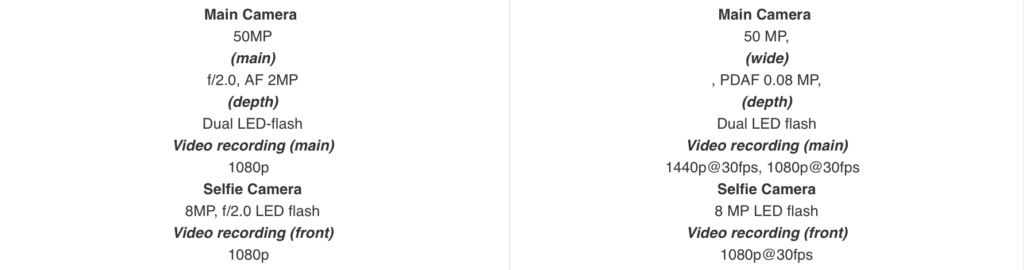 | 50 MP, (wide) 2 MP, (depth) 8 MP, (selfie) 1080p (rear video) 1080p (front video) | Camera | 50 MP, (wide) 0.08 MP, (depth) 8 MP, (selfie) 1440p (rear video) 1080p@30fps (front video) |
