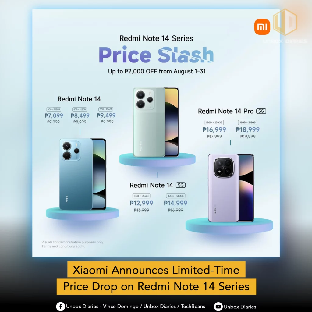 From August 1 to August 31,2025, the REDMI Note 14 Price Slash promo offers discounts of up to ₱2,000 off on select variants of the REDMI Note 14 Series. This limited-time offer is available exclusively through Xiaomi’s official stores on Shopee and Lazada.