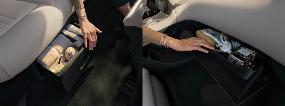 Even with its low-slung, sporty profile, the Xiaomi YU7 still offers spacious, comfortable cabin room. Designed using an 188 cm anthropometric model, the cabin offers generous accommodations with 100 mm front headroom, 77 mm rear headroom, and 73 mm rear legroom. The rear seats also fold flat at the touch of a button, instantly transforming into a 1.8m bed. When it comes to storage, the Xiaomi YU7 provides 36 compartments throughout the cabin. The front trunk offers 141 L of space, which comfortably fits a 24-inch suitcase. The rear trunk holds up to 687 L and fits three 24-inch suitcases, three 20-inch suitcases, and two large travel bags with ease, making it easy for a family of four to pack for a trip. Fold the rear seats down, and trunk capacity expands to 1,758 L, offering plenty of room for a full set of camping gear. A spacious 13.7 L password glove box features voice- and password-activated locking for more secure storage of valuables, and comes with a dedicated organizer to keep smaller items neat and easy to access. The rear drawer provides 5.2 L of extra space — perfect for tissues, blankets, toys, and other everyday essentials.
